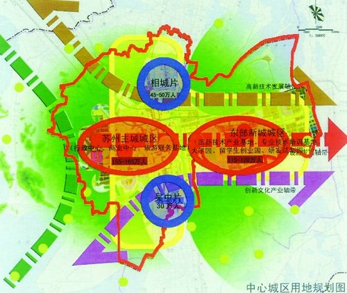 总体设计提出,未来苏城可形成“T轴双城两片”的总体结构。T轴是指主城城区(古城和高新区)、新城城区(主要是园区)构成东西向横轴,相城和吴中片组成南北向纵轴;双城是由主城城区和新城城区组成;两片指围绕吴中和相城形成的城市功能片区。为了给主城中心注入活力,总体设计提出了干将路西延的设想。