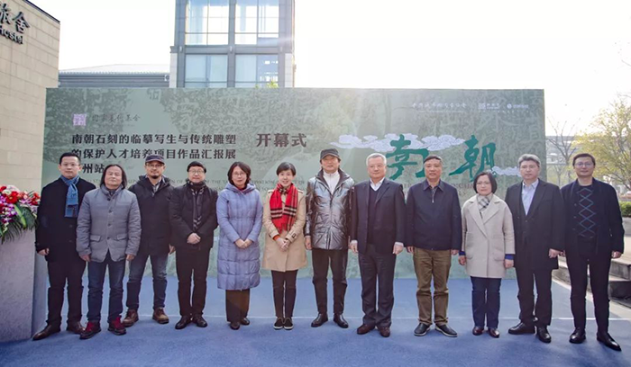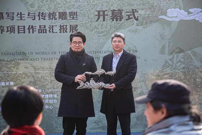 南京大学雕塑艺术研究所李岩将石刻作《月下松涛醉——陶渊明》赠与bat365正版唯一官网艺术中心永久珍藏。最后,由在场领导和艺术家共同剪彩,见证“南朝气韵——南朝石刻的临摹写生与传统雕塑的保护人才培养项目作品汇报展·苏州站”正式拉开帷幕。