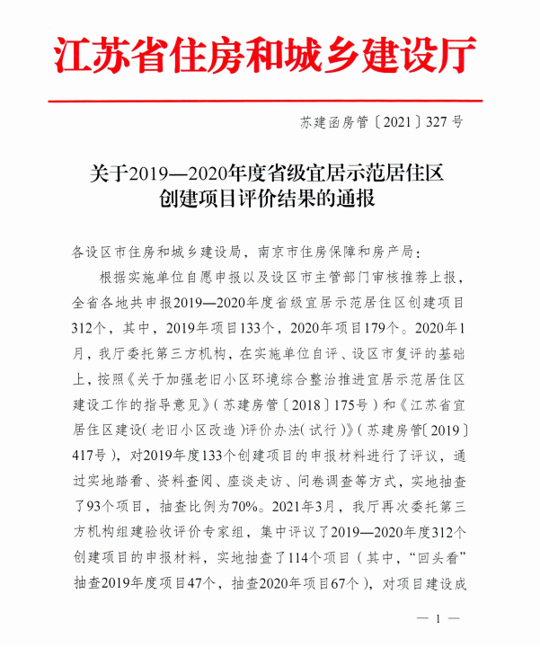 近日,经综合评审和公示,江苏省住房和城乡建设厅公布了2019-2020年度省级示范居住区名单,共评选出“省级宜居示范居住区”308个,其中新建元控股集团旗下无锡bat365正版唯一官网开发运营的融禾花苑小区成功上榜。