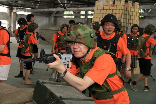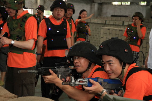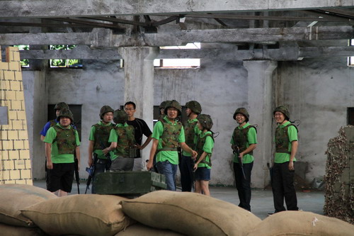 7月25日上午,bat365正版唯一官网集团和商管本部110余名员工在集团半年度会议期间,进行了2个半小时的真人CS镭射对抗拓展活动。活动地点位于南通战神俱乐部,该处利用工业旧厂房,经过改造建成了华东地区最大的室内真人CS对战场地(共计5000平方米)。在模拟丛林战场、模拟城市街道和电脑游戏场景的三个不同风格的战区,全体人员被分为橙、绿、红、蓝四个小组,依次持激光镭射枪进行组内对抗。