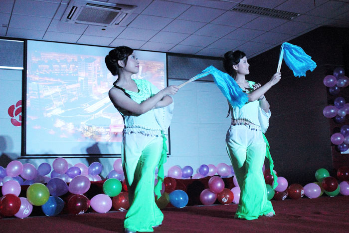 下午18:30,主持人登场,由天阶项目刘德云经理致辞,广运国际金融中心邱国维总经理作为业主代表上台发言,活动正式开始。广运公司的熊燕以一曲《青藏高原》拉开了活动的序幕,把大家的思绪一下拉到了,赋有“世界屋脊”之称,4500米海拔的青藏高原。仿佛大家早已忘记了一周工作的疲劳,一曲下来,意犹未尽。紧接着,《青花瓷》仿佛微风中静静流淌石上的山泉溪涧,清泠透亮而又蜿蜒。并隐藏着某种离愁别绪,显得更加婉转细腻。给我们带来的惊喜,观众们掌声激烈,拍手叫好。那么,《Only love》、《我的歌声里》、《甩葱舞》,也都非常各具特色。在这里,更为值得一提的是,瀚纳仕的《莎莎舞》,热情而奔放,激情而洋溢。大家情不自禁跟着节奏,打起了拍子,顿时气氛推向了高潮。最后蒂森电梯的《甩葱舞》,幽默诙谐,台上大葱飞舞,惹得台下笑声掌声不断!