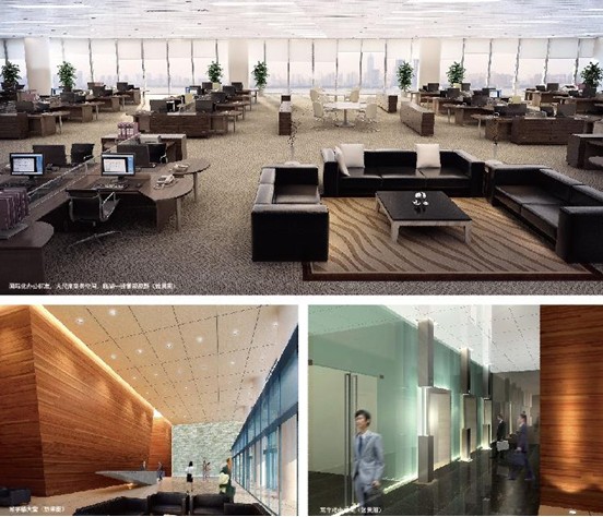 交房现场,跟随业主走入写字楼大堂,挑高11.3米的超高大堂尽显宽敞气派的卓越风度,进口大理石地面结合高档木纹理铝板背景墙,在入口处装饰面上就体现了超越高端商务形象的品质感;14部进口高速迅达电梯,高中低区群控运行,电梯轿厢按键摒弃传统按键控制方式,而采用国际化的透光数字电子触屏按键,高科技的运用区别于其他传统写字楼,更加凸显现代化智能控制;进入业主所在楼层,宽敞明亮的公共走道结合单元间的通透双层玻璃隔断,最大程度的采集室内光度至公共区域,一进入楼层顿时感受到采用“新风流动场”设计原理,构筑会呼吸的生态建筑体的概念;业主的敞开式办公室内,无柱设计发挥极致想象的功能参考空间,展示着国际化品质的细节之处,精装修楼层的室内标准中,架高网格金属地板高达8厘米,可以根据企业的自身要求自由布局,约3米的室内净高更是突破了传统写字楼2.7米这个难以突破的室内高度,空间开阔度超越想象,在此我们体会着现代化高科技带给我们的无限思考,时间与空间将不再是难以跨越的距离。