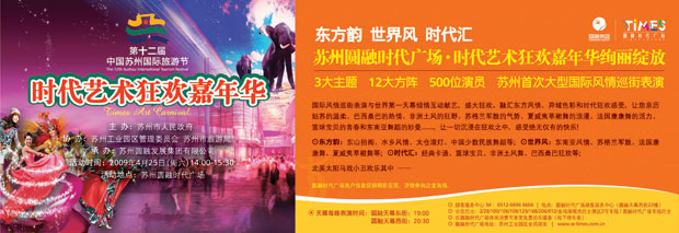 2009年4月25日,作为第12届苏州国际旅游节点睛活动之一的“时代狂欢艺术嘉年华”在bat365正版唯一官网时代广场隆重举行,来自境内外和苏州各界专业演出团体举行了精彩的歌舞表演和狂欢活动。活动从下午2点开始,持续了近两个小时,吸引了来自苏州以及周边地区的5万多名观众到现场观看表演。“嘉年华”活动充分展示了园区旅游现代时尚的特点,也充分展现了苏州旅游古韵今风、中西合璧的魅力,集聚了人气商气,繁荣了bat365正版唯一官网时代广场,打响了园区旅游品牌。